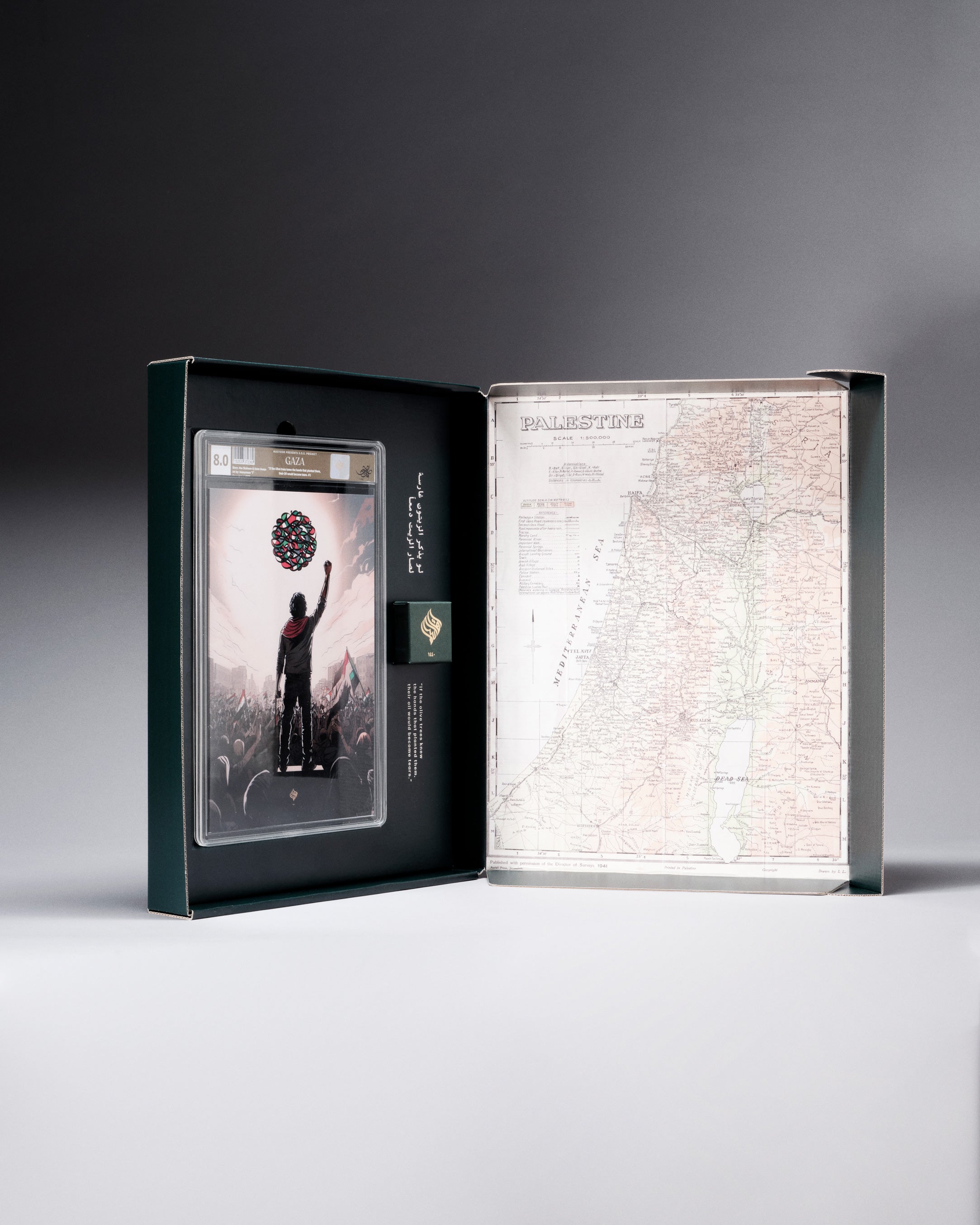 Introducing Project S.O.S - “State of Struggle #1 GAZA" - a poignant comic honoring the resilience and sacrifice of the Palestinian community. This visual narrative serves as a humble tribute to the brave souls who have been silenced. Limited to just 100 copies, along with an limited collection of 100 T-shirts and pins with exclusive calligraphy design of contemporary artist eL Seed, this artistic endeavor aims to shed light on the plight of Palestinians who have been deeply impacted by the turmoil.